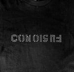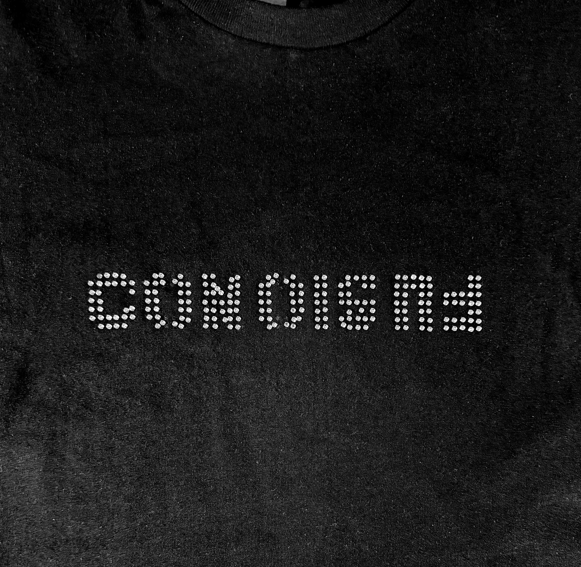 Rhinestones on fabric plus silk-screen stamp.