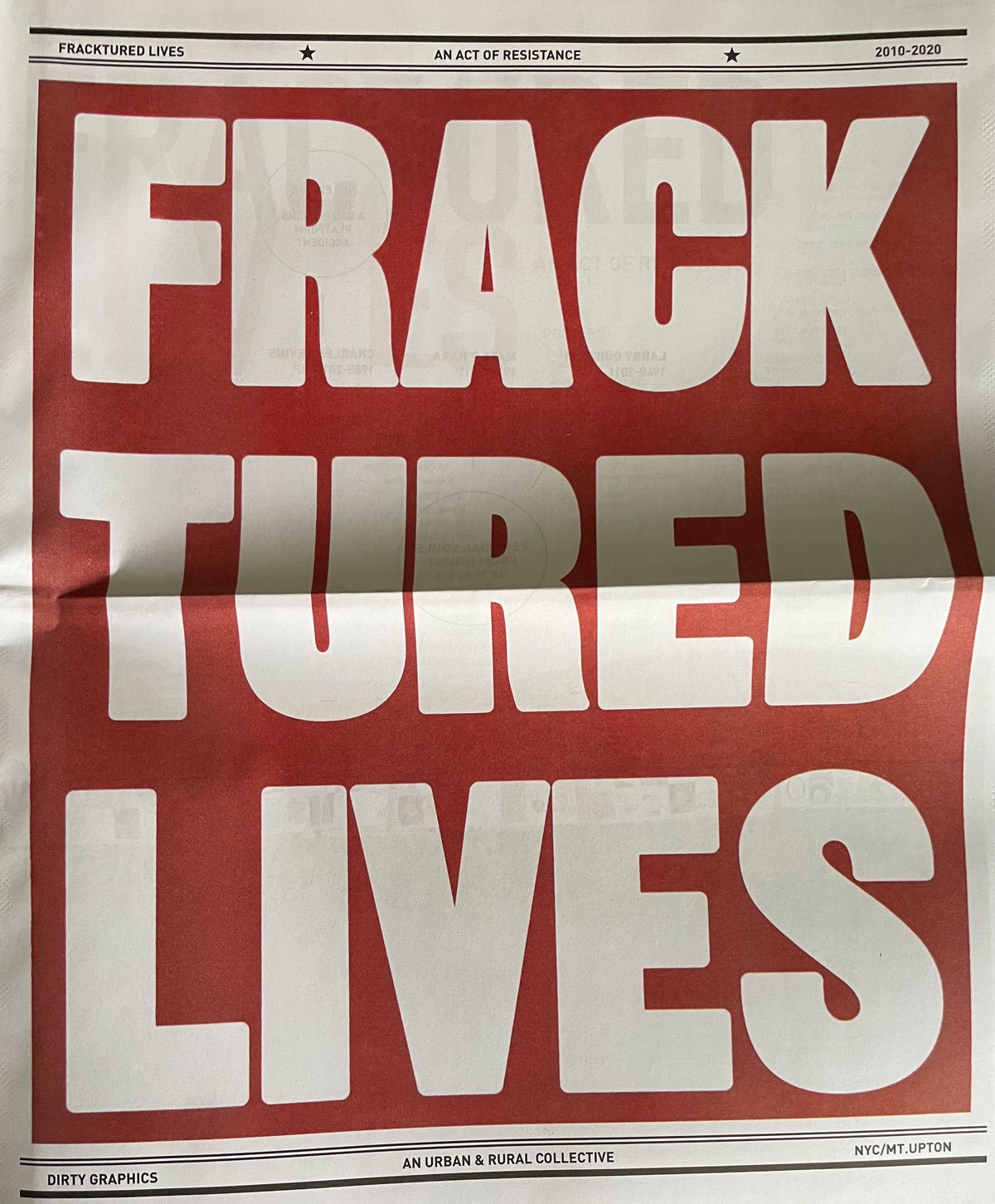 36 pages in color. 2010-2020. Edited by Andrew Castrucci, from book and poster project "Fracktured Lives". Signed and stamped newspapers available for $25.