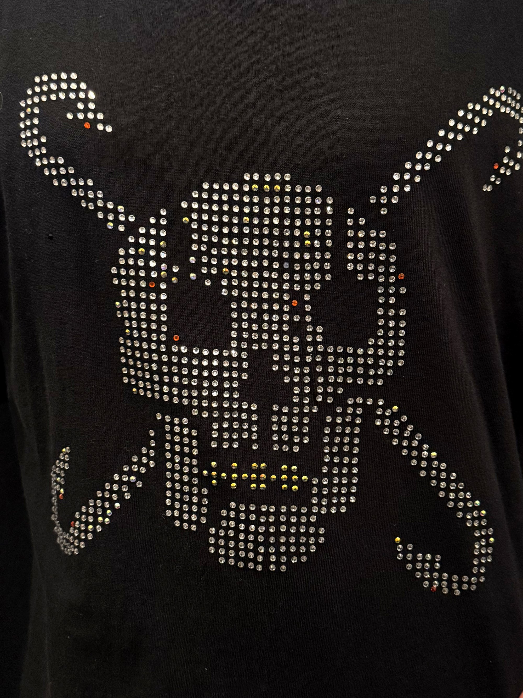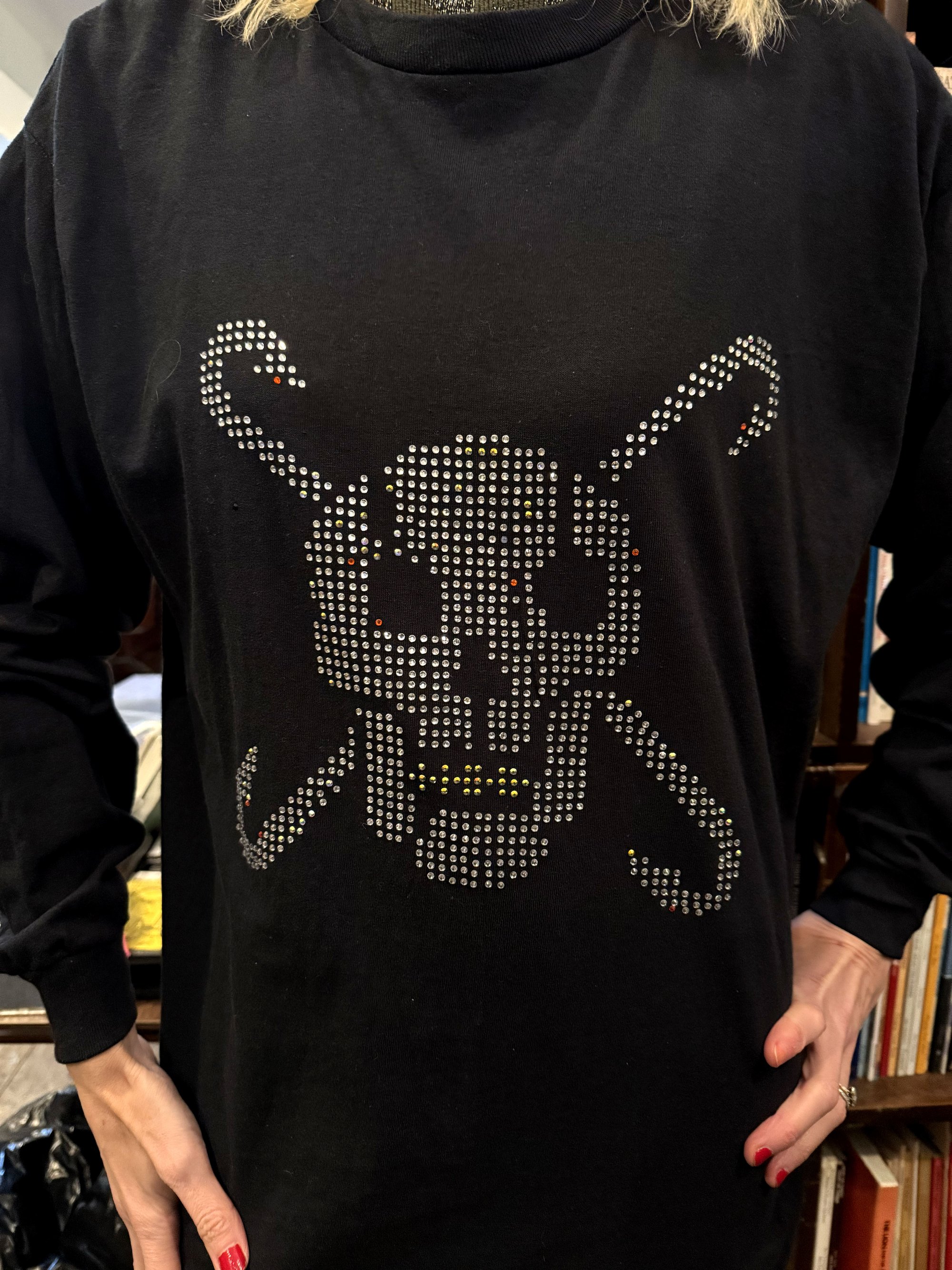Rhinestones on fabric plus silk-screen stamp.
